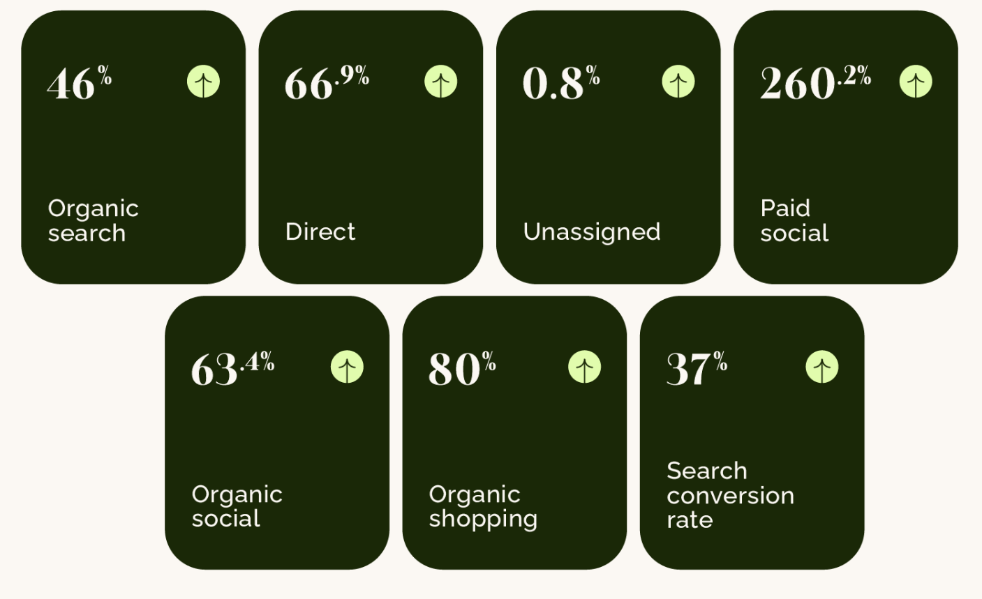 - Organic search grew by 46%, driven by strategic SEO-focused blogs and product content.